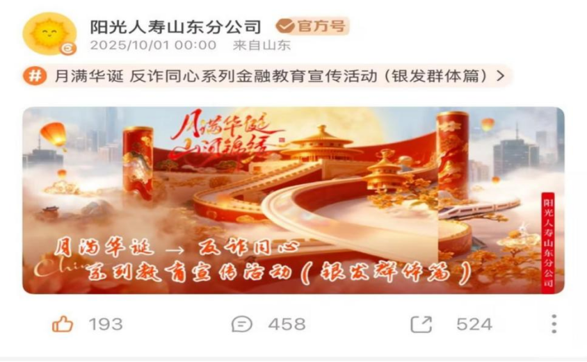 为进一步做好常态化金融教育宣传工作亿腾证券,创新开展全方位、广覆盖、多场景的金融教育宣传活动,阳光人寿山东分公司在2025年特别开展每月一个系列金融教育话题线上宣传活动。10月份,阳光人寿山东分公司紧扣国庆、中秋双节主题,特别推出“月满华诞 反诈同心”系列金融教育宣传活动。