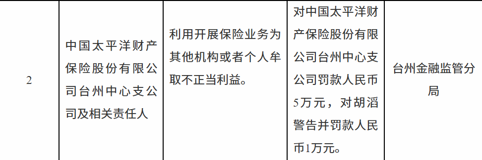 10月13日,国家金融监督管理总局台州监管分局行政处罚信息公开表显示,中国太平洋财产保险股份有限公司台州中心支公司及相关责任人因利用开展保险业务为其他机构或者个人牟取不正当利益被罚款人民币5万元华丰金服,对胡某警告并罚款人民币1万元。